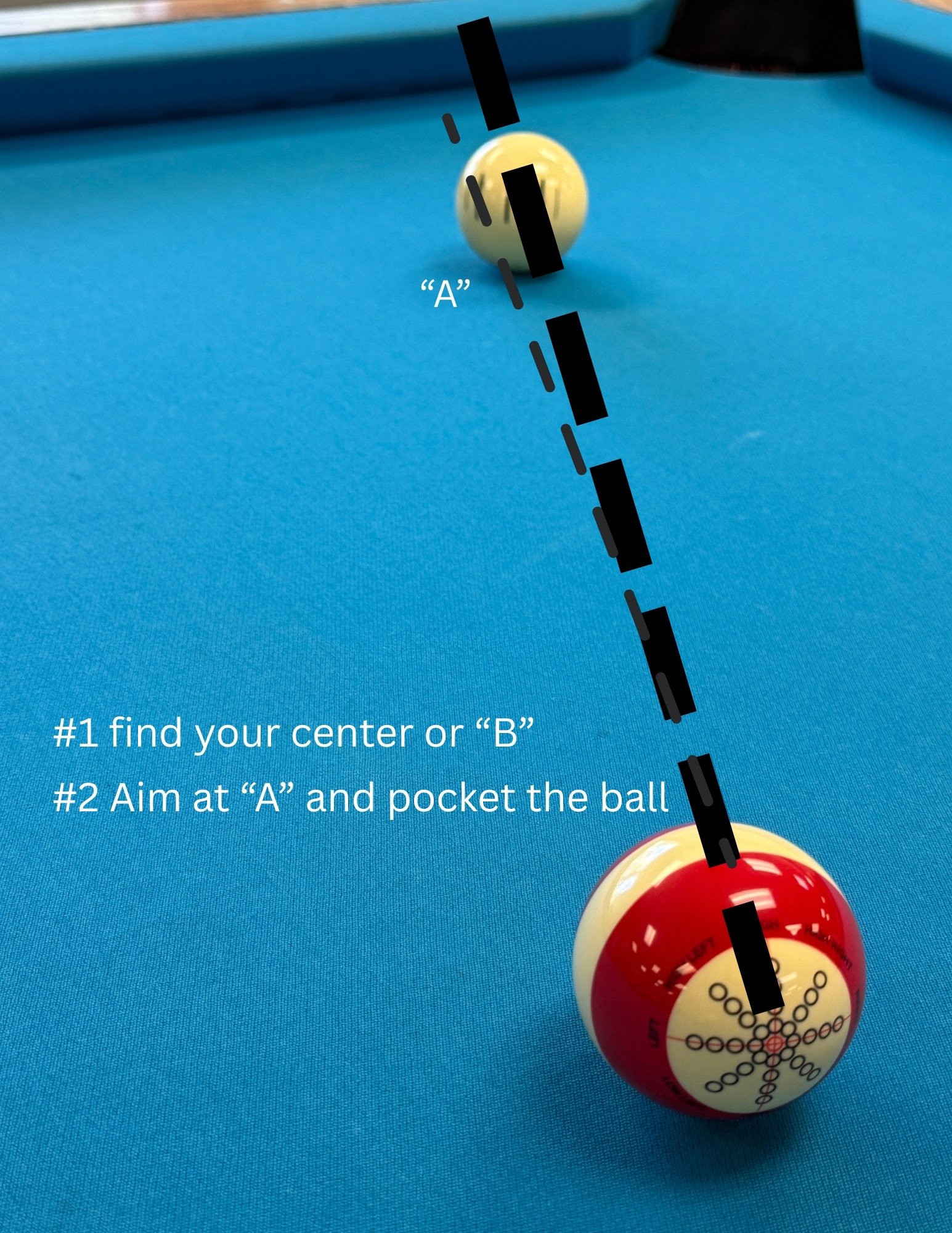 To begin utilizing the Ryder Method effectively, it is essential to locate the center of the object ball. This involves visualizing or marking a line from the cue ball to the OB that you aim to the rail. Once the center of the OB has been identified, the next step is to execute a half-tip pivot to the "A" on the object ball. This pivoting movement is crucial, as it allows players to adjust their angle of projection accurately before taking the shot.